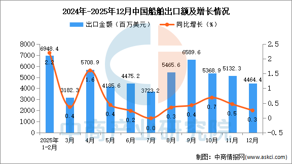 从金额方面来看,2025年12月中国船舶出口金额4464.4百万美元,同比增长0.3%;1-12月我国船舶累计出口金额55084.9百万美元,同比增长26.7%。