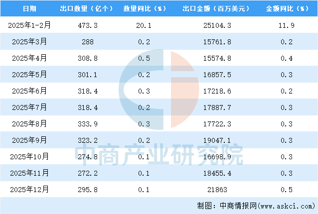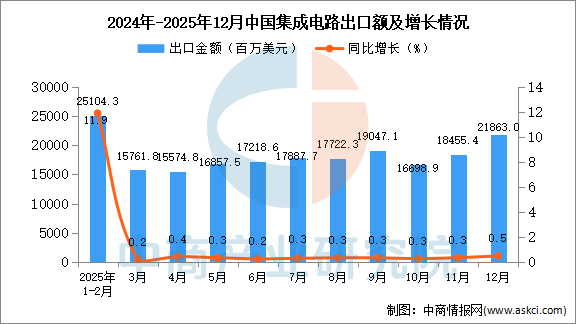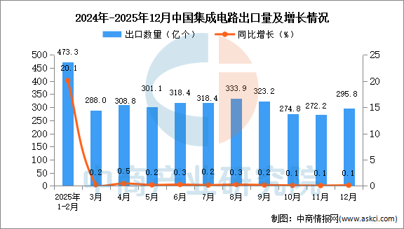 中商情报网讯:据中商产业研究院数据库显示,2025年12月中国集成电路出口量295.8亿个,同比增长0.1%;1-12月中国集成电路出口量3494.7亿个,同比增长17.4%。