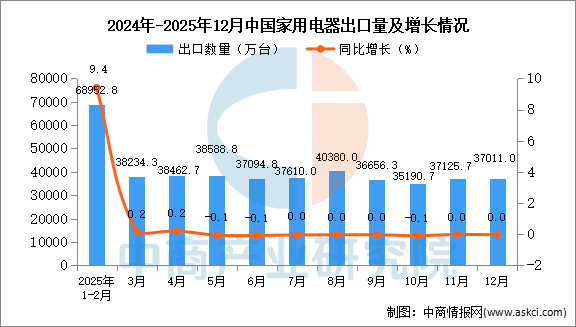 中商情报网讯:据中商产业研究院数据库显示,2025年12月中国家用电器出口量37011万台,同比增长持平;1-12月中国家用电器出口量445294.7万台,同比下降0.6%。