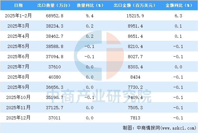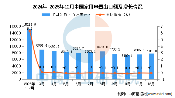 2025年12月中国家用电器出口量及金额增长情况