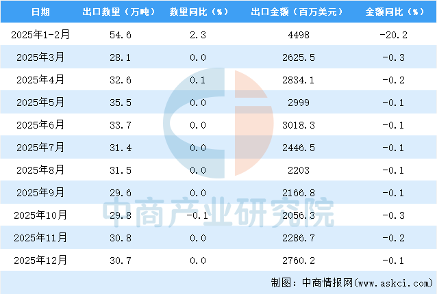 从金额方面来看,2025年12月中国箱包及类似容器出口金额2760.2百万美元,同比下降0.1%;1-12月中国箱包及类似容器出口金额29888.2百万美元,同比下降13.5%。