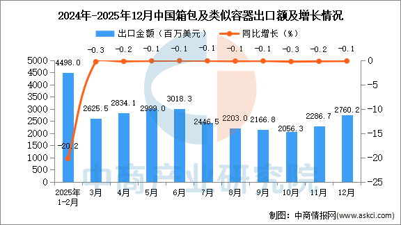 2025年12月中国箱包及类似容器出口量及金额增长情况