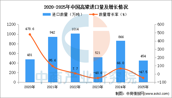 中商情报网讯:据中商产业研究院数据库显示,2024年中国高粱进口量866万吨,同比增长66%。最新数据显示,2025年1-12月中国高粱进口量454万吨,同比下降47.5%。