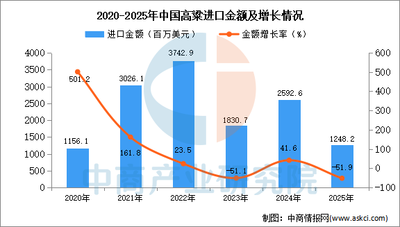 从金额方面来看,数据显示,2025年1-12月中国高粱进口金额1248.2百万美元,同比下降51.9%。
