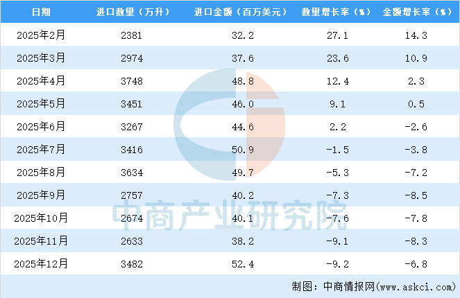 2025年12月中国啤酒进口量及金额增长情况