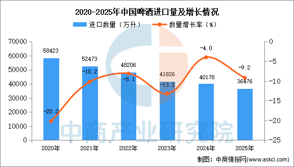 中商情报网讯:据中商产业研究院数据库显示,近几年,我国啤酒进口量呈下降趋势,2024年中国啤酒进口量40178万升,同比下降4%。最新数据显示,2025年1-12月中国啤酒进口量36476万升,同比下降9.2%。
