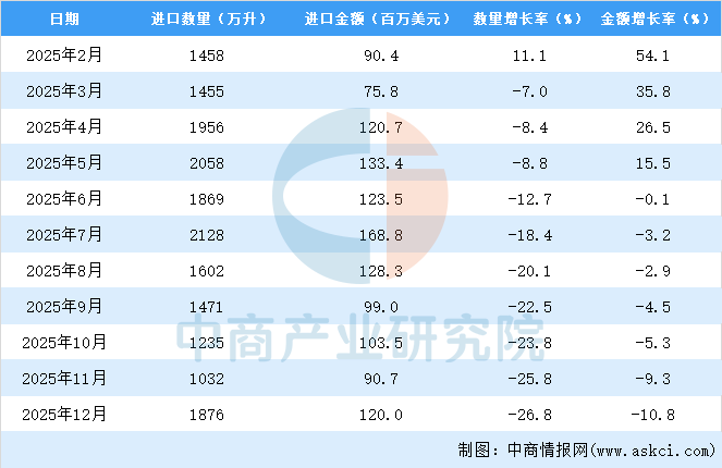 2025年12月中国葡萄酒进口量及金额增长情况