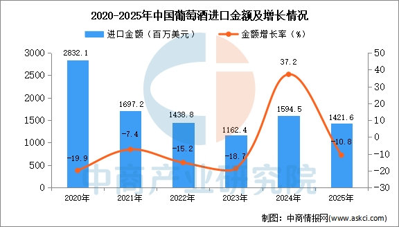 从金额方面来看,数据显示,2025年1-12月中国葡萄酒进口金额1421.6百万美元,同比下降10.8%。