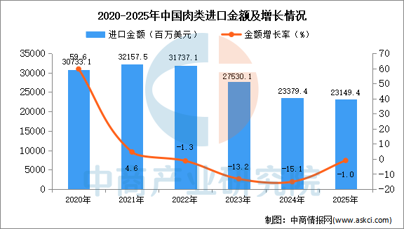 从金额方面来看,数据显示,2025年1-12月中国肉类(包括杂碎)进口金额23149.4百万美元,同比下降1%。