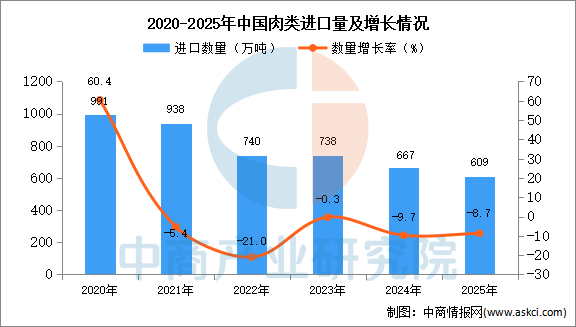 中商情报网讯:据中商产业研究院数据库显示,2024年中国肉类(包括杂碎)进口量667万吨,同比下降9.7%。最新数据显示,2025年1-12月中国肉类(包括杂碎)进口量609万吨,同比下降8.7%。