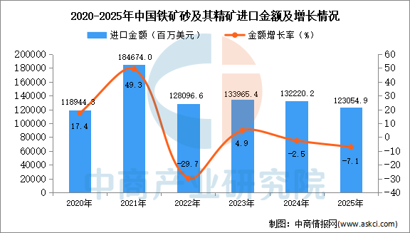 从金额方面来看,数据显示,2025年1-12月中国铁矿砂及其精矿进口金额123054.9百万美元,同比下降7.1%。