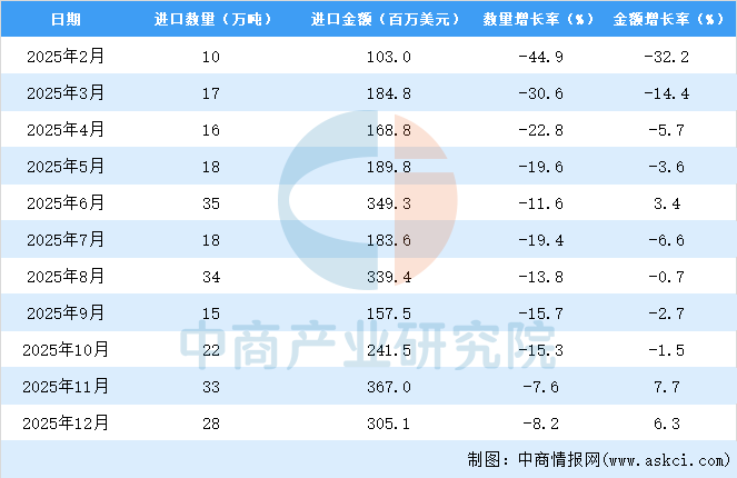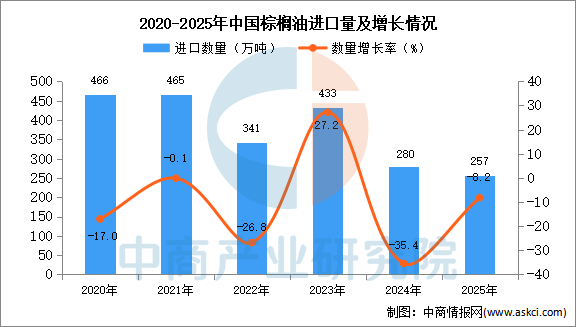 中商情报网讯:据中商产业研究院数据库显示,2024年中国棕榈油进口量280万吨,同比下降35.4%。最新数据显示,2025年1-12月中国棕榈油进口量257万吨,同比下降8.2%。