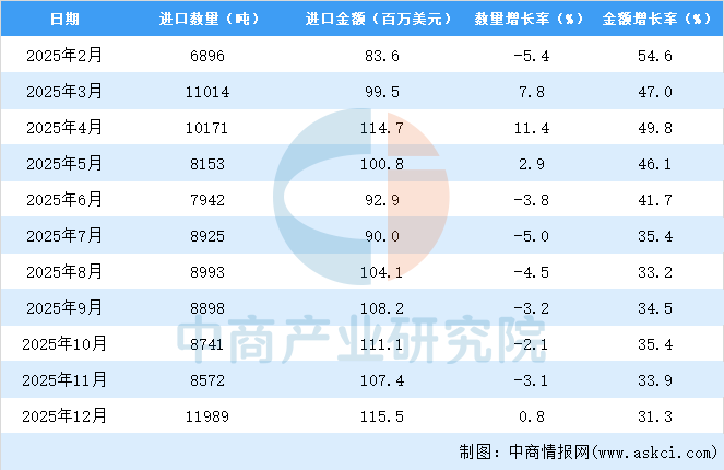 从金额方面来看,数据显示,2025年1-12月中国玻璃纤维及其制品进口金额1222百万美元,同比增长31.3%。