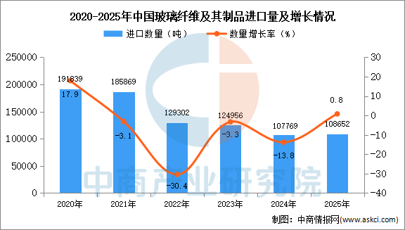 中商情报网讯:据中商产业研究院数据库显示,2024年中国玻璃纤维及其制品进口量107769吨,同比下降13.8%。最新数据显示2025年1-12月,中国玻璃纤维及其制品进口量108652吨,同比增长0.8%。