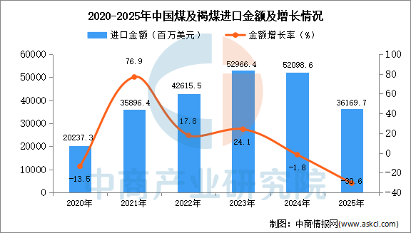 从金额方面来看,数据显示,2025年1-12月中国煤及褐煤进口金额36169.7百万美元,同比下降30.6%。
