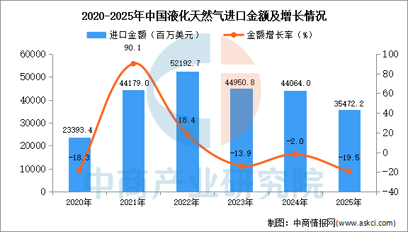 从金额方面来看,数据显示,2025年1-12月中国液化天然气进口金额35472.2百万美元,同比下降19.5%。