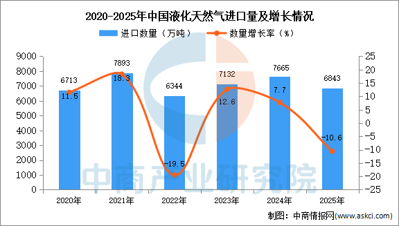 中商情报网讯:据中商产业研究院数据库显示,2024年中国液化天然气进口量7665万吨,同比增长7.7%。最新数据显示,2025年1-12月中国液化天然气进口量6843万吨,同比下降10.6%。