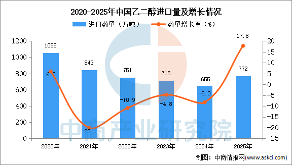 中商情报网讯:据中商产业研究院数据库显示,2024年中国乙二醇进口量655万吨,同比下降8.3%。最新数据显示,2025年1-12月中国乙二醇进口量772万吨,同比增长17.8%。