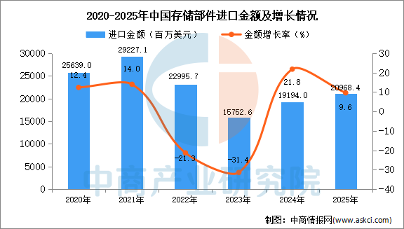 从金额方面来看,数据显示,2025年1-12月中国存储部件进口金额20968.4百万美元,同比增长9.6%。