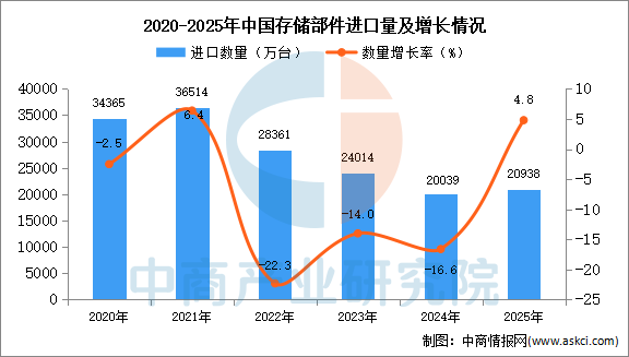 中商情报网讯:据中商产业研究院数据库显示,2024年中国存储部件进口量20039万台,同比下降16.6%。最新数据显示,2025年1-12月中国存储部件进口量20938万台,同比增长4.8%。