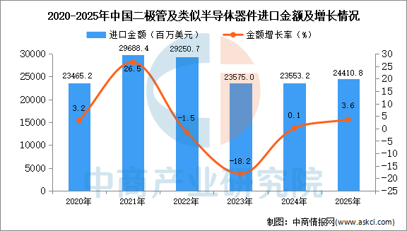 从金额方面来看,数据显示,2025年1-12月中国二极管及类似半导体器件进口金额24410.8百万美元,同比增长3.6%。