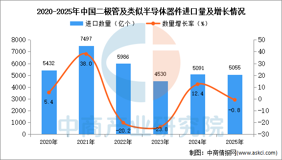 中商情报网讯:据中商产业研究院数据库显示,2024年中国二极管及类似半导体器件进口量5091亿个,同比增长12.4%。最新数据显示,2025年1-12月中国二极管及类似半导体器件进口量5055亿个,同比下降0.8%。