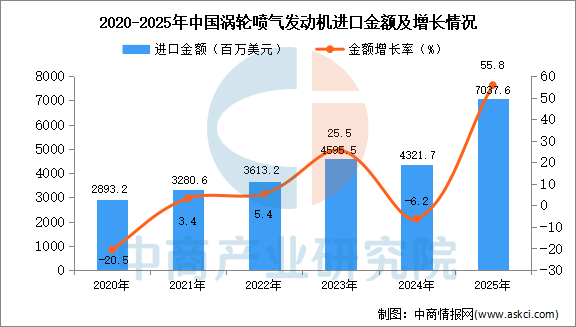 从金额方面来看,数据显示,2025年1-12月中国涡轮喷气发动机进口金额7037.6百万美元,同比增长55.8%。