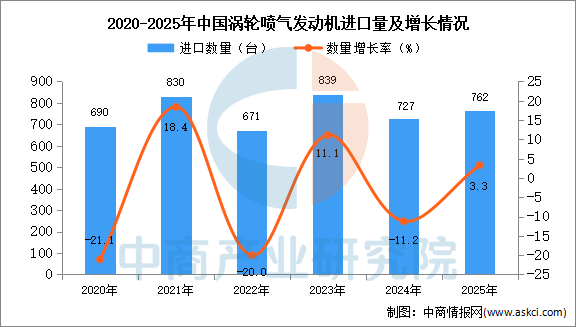 中商情报网讯:据中商产业研究院数据库显示,2024年中国涡轮喷气发动机进口量727架,同比下降11.2%。最新数据显示,2025年1-12月中国涡轮喷气发动机进口量762架,同比增长3.3%。