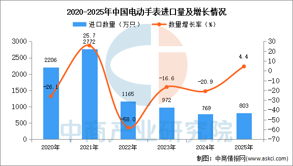 中商情报网讯:据中商产业研究院数据库显示,2024年中国电动手表进口量769万只,同比下降20.9%。最新数据显示,2025年1-12月中国电动手表进口量803万只,同比增长4.4%。