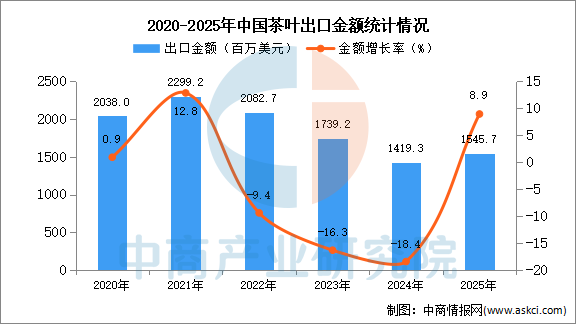 从金额方面来看,数据显示,2025年1-12月中国茶叶出口金额1545.7百万美元,同比增长8.9%。
