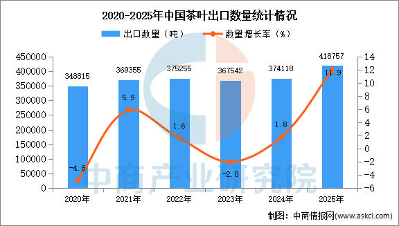 中商情报网讯:据中商产业研究院数据库显示,2024年我国茶叶的出口量374118吨,同比增长1.8%。最新数据显示,2025年1-12月中国茶叶出口量418757吨,同比增长11.9%。
