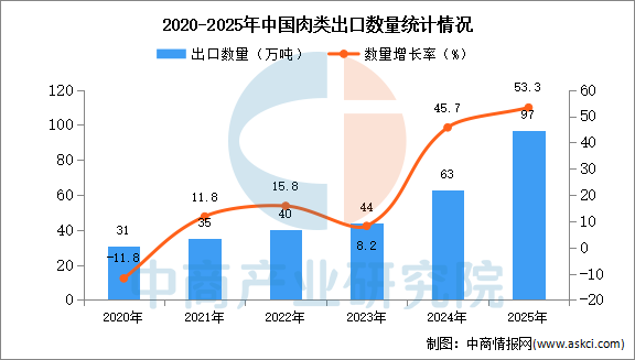 中商情报网讯:据中商产业研究院数据库显示,2024年中国肉类(包括杂碎)出口量63万吨,同比增长45.7%。最新数据显示,2025年1-12月中国肉类(包括杂碎)出口量97万吨,同比增长53.3%。