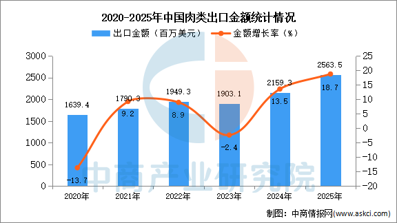 从金额方面来看,数据显示,2025年1-12月中国肉类(包括杂碎)出口金额2563.5百万美元,同比增长18.7%。
