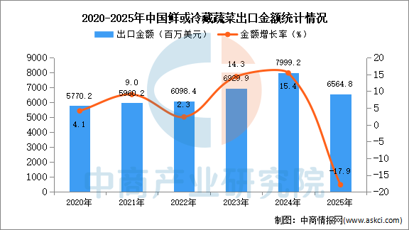 从金额方面来看,数据显示,2025年1-12月中国鲜或冷藏蔬菜出口金额6564.8百万美元,同比下降17.9%。