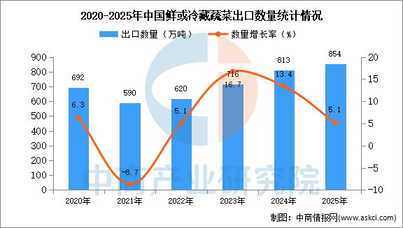 中商情报网讯:据中商产业研究院数据库显示,2024年我国鲜或冷藏蔬菜的出口量813万吨,同比增长13.4%。最新数据显示,2025年1-12月中国鲜或冷藏蔬菜出口量854万吨,同比增长5.1%。