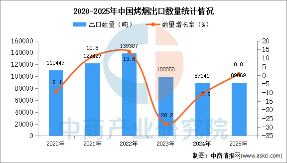 中商情报网讯:据中商产业研究院数据库显示,2024年我国烤烟的出口量89141吨,同比下降10.9%。最新数据显示,2025年1-12月中国烤烟出口量89869吨,同比增长0.8%。