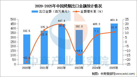 从金额方面来看,数据显示,2025年1-12月中国烤烟出口金额453.8百万美元,同比增长10.9%。