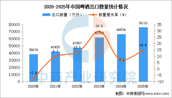 中商情报网讯:据中商产业研究院数据库显示,2024年我国啤酒的出口量66534万升,同比增长7.1%。最新数据显示,2025年1-12月中国啤酒出口量76110万升,同比增长14.4%。