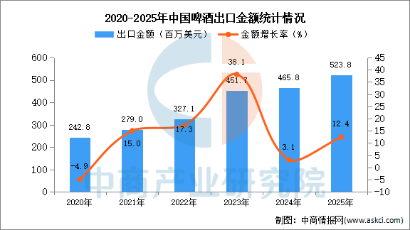 从金额方面来看,数据显示,2025年1-12月中国啤酒出口金额523.8百万美元,同比增长12.4%。