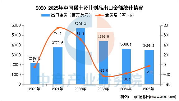 从金额方面来看,数据显示,2025年1-12月中国稀土及其制品出口金额3498.2百万美元,同比下降2.8%。