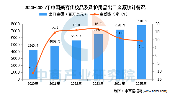从金额方面来看,数据显示,2025年1-12月中国美容化妆品及洗护用品出口金额7816.3百万美元,同比增长9.1%。