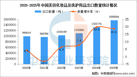 中商情报网讯:据中商产业研究院数据库显示,2024年我国美容化妆品及洗护用品出口量1320774吨,同比增长19.8%。最新数据显示,2025年1-12月中国美容化妆品及洗护用品出口量1565694吨,同比增长18.6%。