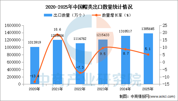 中商情报网讯:据中商产业研究院数据库显示,2024年我国帽类出口量1318517万个,同比增长8.7%。最新数据显示,2025年1-12月中国帽类出口量1385645万个,同比增长5.1%。