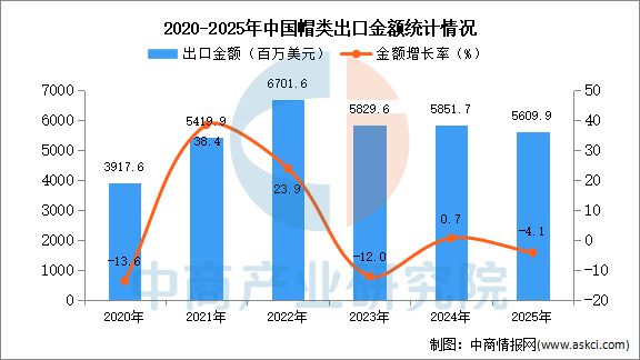 从金额方面来看,数据显示,2025年1-12月中国帽类出口金额5609.9百万美元,同比下降4.1%。