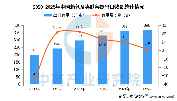 中商情报网讯:据中商产业研究院数据库显示,2024年我国箱包及类似容器出口量362万吨,同比增长9.6%。最新数据显示,2025年1-12月中国箱包及类似容器出口量368万吨,同比增长1.6%。