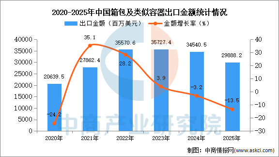 从金额方面来看,数据显示,2025年1-12月中国箱包及类似容器出口金额29888.2百万美元,同比下降13.5%。