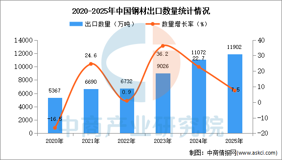 中商情报网讯:据中商产业研究院数据库显示,2024年中国钢材出口量11072万吨,同比增长22.7%。最新数据显示,2025年1-12月中国钢材出口量11902万吨,同比增长7.5%。