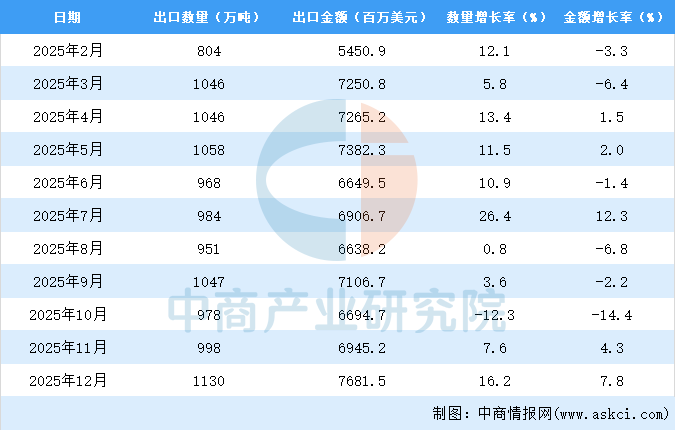 2025年12月中国钢材出口量及金额增长情况