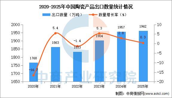 中商情报网讯:据中商产业研究院数据库显示,2024年我国陶瓷产品出口量1957万吨,同比增长2.8%。最新数据显示,2025年1-12月中国陶瓷产品出口量1962万吨,同比增长0.3%。