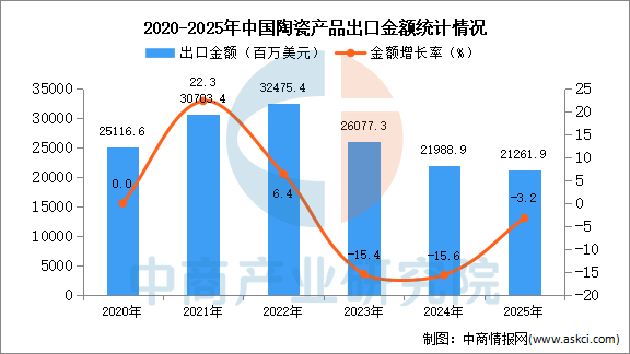 从金额方面来看,数据显示,2025年1-12月中国陶瓷产品出口金额21261.9百万美元,同比下降3.2%。